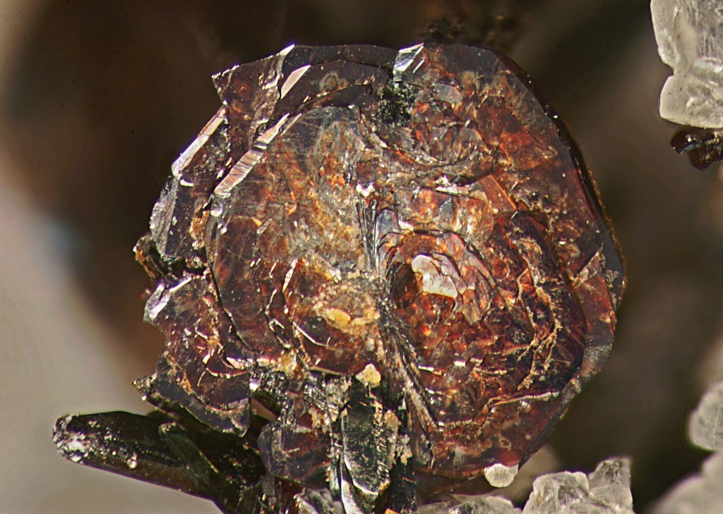 Rarely as rosettes of hexagonal plates, typically granular, scaly; occurs as exsolution lamenae in franklinite and spinel
