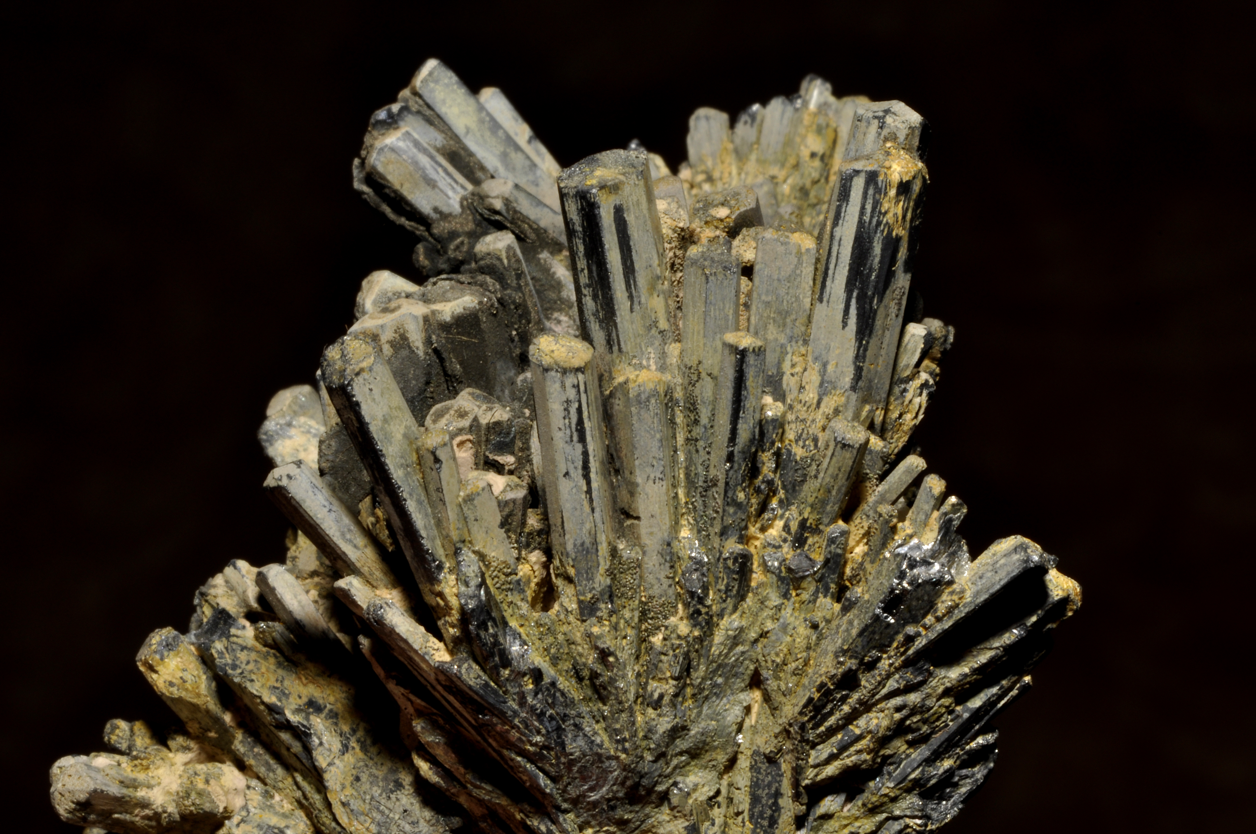 Massive, radiating and elongated crystals. Massive and granular